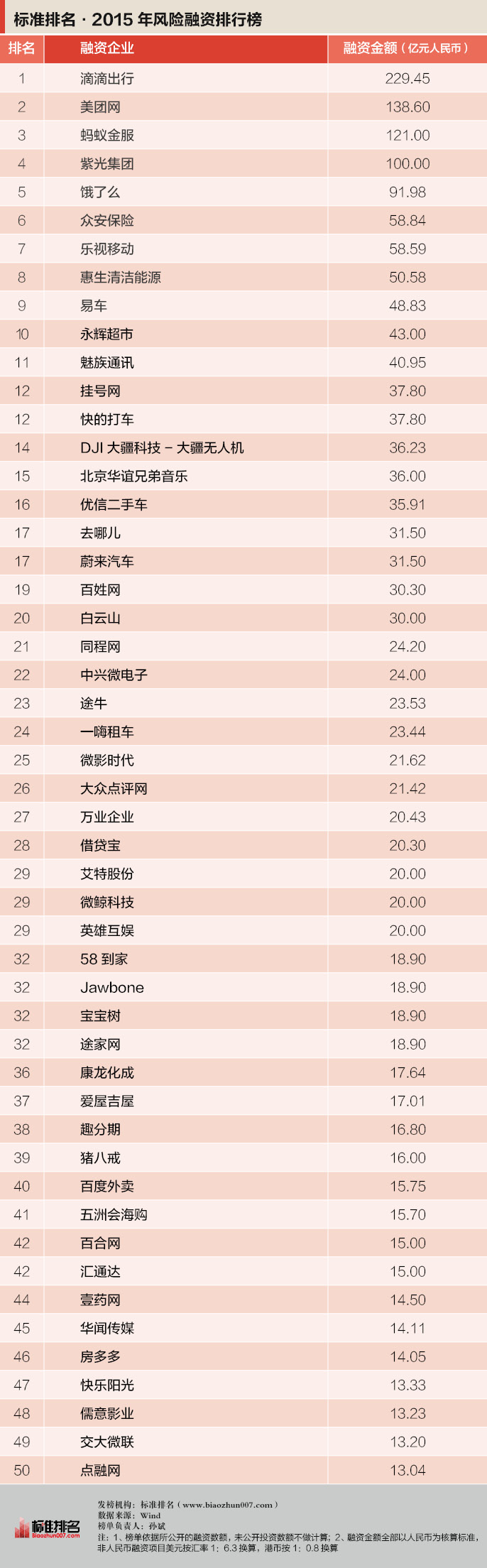 【標(biāo)準(zhǔn)排名】2015年風(fēng)投追捧的50家公司 坐滴滴吃美團(tuán)