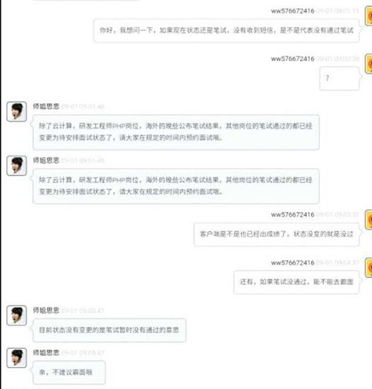 洪羽是電子商務(wù)專業(yè)大四的學(xué)生,參加阿里巴巴校招經(jīng)過(guò)了筆試正在等結(jié)果。她最開始得知“縮招”的消息還是從幾個(gè)分享群里。暑期在加拿大實(shí)習(xí)的洪羽一早起床發(fā)現(xiàn)自己加的幾個(gè)分享群都已經(jīng)吵翻了天。這時(shí)大家都在等待筆試結(jié)果發(fā)布、預(yù)約下一步面試的節(jié)點(diǎn)上,阿里招聘官網(wǎng)上卻突然發(fā)布縮招通知,緊接著就有同學(xué)在客服那證實(shí)了消息,并被告知除了技術(shù)類崗位,“網(wǎng)申頁(yè)面狀態(tài)仍停留在筆試階段就意味筆試沒通過(guò)”。