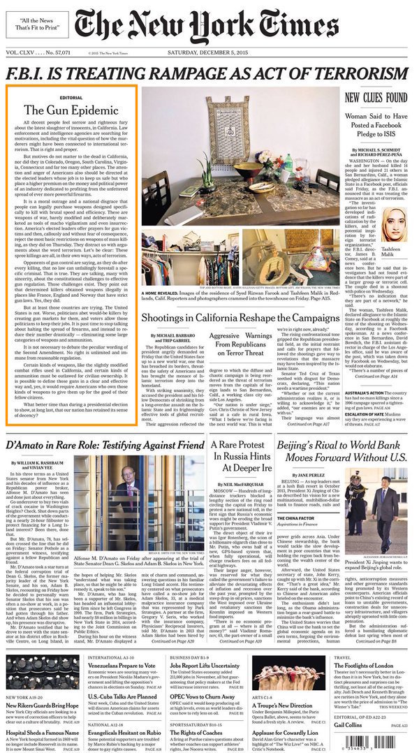而以下是美國一線政客就該事件在 Twitter 上發(fā)布的推文。這些推文被放在了 2015 年 12 月 3 日《紐約每日新聞》(New York Daily News)的頭版上。