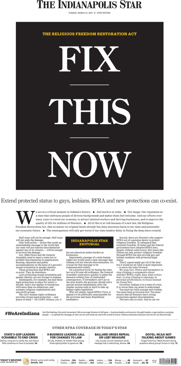 隨著社會矛盾的與日俱增,專業(yè)的媒體們開始更多采用在頭版頭條發(fā)表社論的方式,來讓越來越多重要的議題被提出和重視。《底特律自由新聞》(The Detroit Free Press)在 2008 年用頭版頭條社論希望政府對當?shù)仄嚇I(yè)推出救助方案;《印第安納波利斯星報》(The Indianapolis Star)曾用一整個頭版刊載社論,反對該州宗教改革法案中歧視 LGBT(女同性戀、男同性戀、雙性戀、跨性別者)群體的條文。