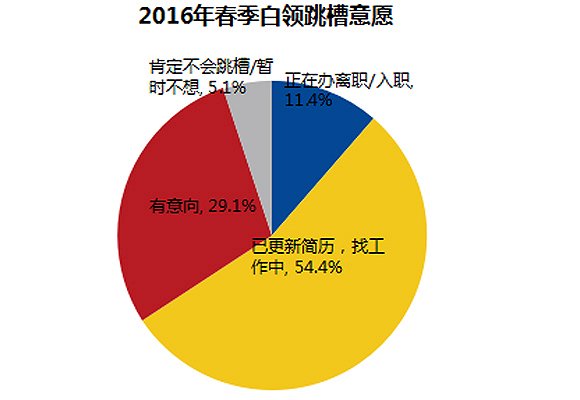 與2014年春季及2015年春秋兩季的調(diào)查結(jié)果相比,2016年春季白領跳槽意愿更加強烈,雖然已經(jīng)跳槽成功的白領比例基本一致,但已經(jīng)開始尋找新工作的白領比例大大增加。已經(jīng)有11.4%的白領開始辦理離職及入職手續(xù),超過一半的白領已經(jīng)開始行動起來,暫時只有想法還沒行動的白領占比為29.1%??隙ú粫鄣谋壤齼H為5.1%。