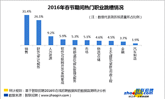 在具體職業(yè)方面,銷售、財務/審計/稅務從業(yè)人員的跳槽意向最強烈,分別占到31.4%和26.1%。人力資源人士以9.2%排名第三。