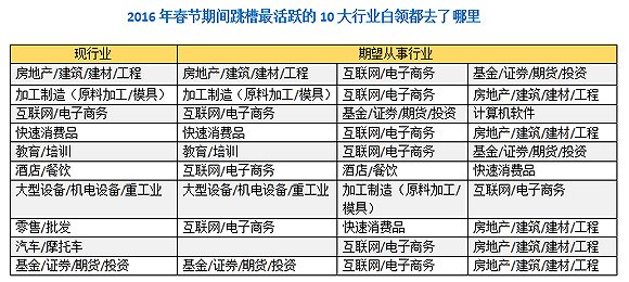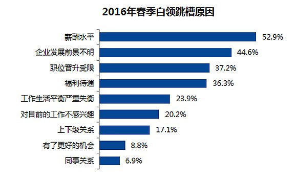 不過,隨著2016年中國人才雇傭市場逐漸回歸理性,大多數(shù)白領的跳槽選擇趨向保守,在現(xiàn)有行業(yè)中尋找發(fā)展前景更好的下家成為主流。